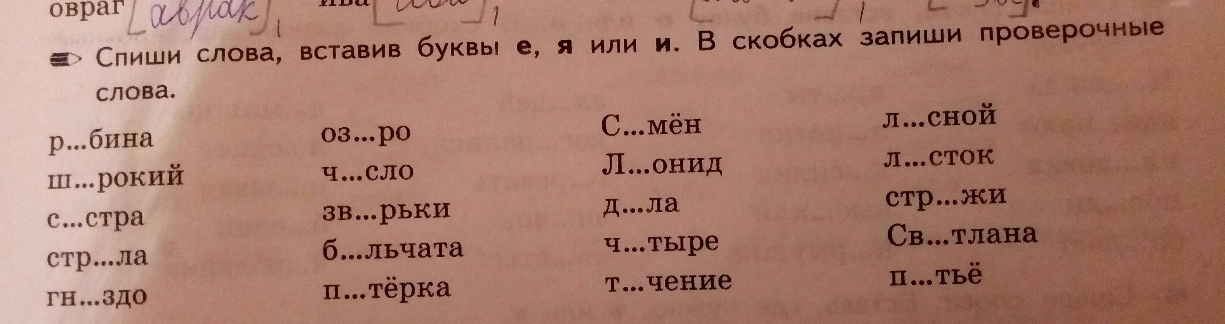 Рябина (словарн.слово, надо запоминать написание),широкий (ширь), сестра(сЁстры), стирала (стирка), гнездо (гнёздышко),озеро (озЁра),число (числа),зверьки(звери),бельчата (белки),пятерка (пять),Семен (Сема),Леонид(ЛЁня),дела(дело), четыре (четверо),течение (течь),лесной (лес),листок (лист),стрижи (стриж), Светлана (Свет), питьё(пИть.)