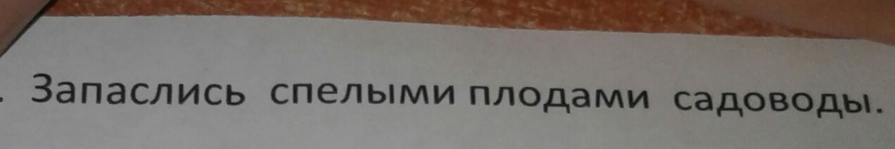 запаслись(сказуемое двумя чертами подчерк.) спелыми(определение волнистой линией подчерк.) плодами(дополнение - - - - - так подчерк.) садоводы(подлежащее одной линией подчерк.)
