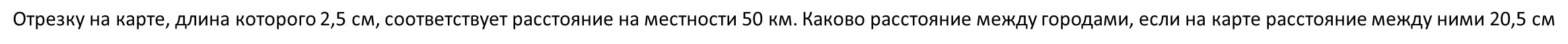 1)Отрезку на карте, длина которого 2,5 см, соответствует расстояние на местности 50 км. Каково расстояние между городами, если на карте расстояние между ними 20,5 см