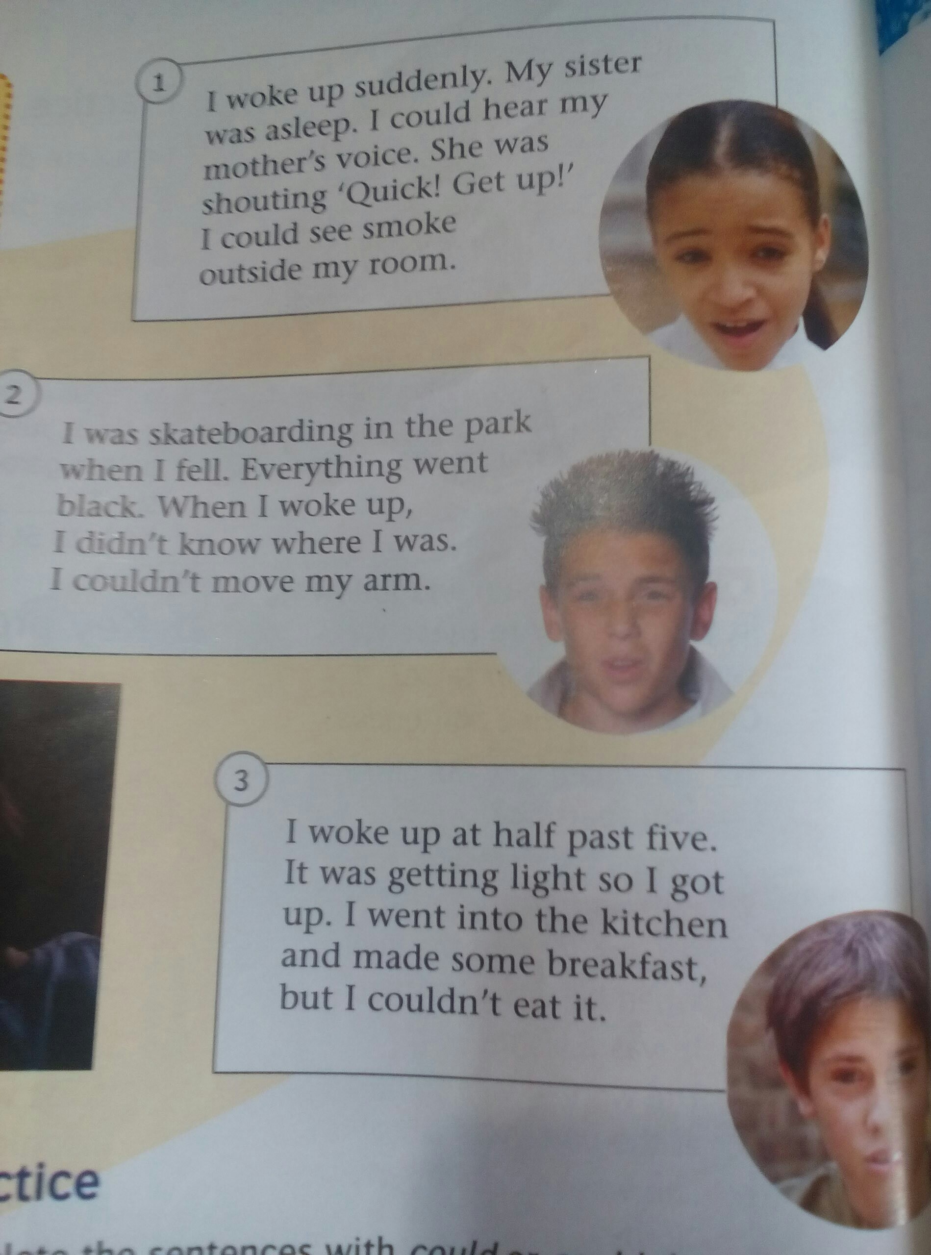 1. Я проснулась рано. Моя сестра ещё спала. Я услышала голос мамы. Она кричала "Быстрее! Вставайте!". Я увидела дым снаружи моей комнаты.