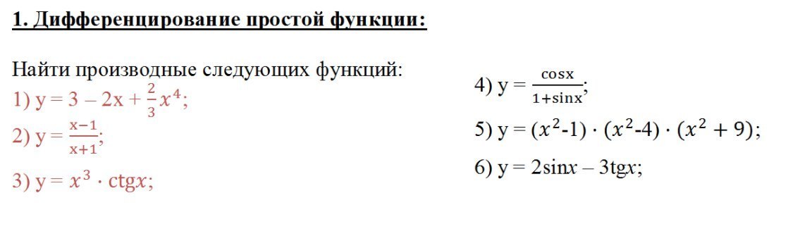 1) y = 3 – 2x + 2/3^4; 2) y = (x−1)/(x+1); 3) y = ^3·ctg; 4) y = (cosx)/(1+sinx); 5) у = (^2-1) ·(^2-4) ·(^2+9); 6) y = 2sinx – 3tgx;