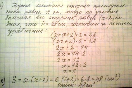 Пусть одна сторона х, другая y =x+2. 2*(х+(Х+2))=28, 2(2х+2)=28, 4х+2=28, 4х=26, Х=6, y= 6+2=8, S =1/2xy=1/2*6*8=24
