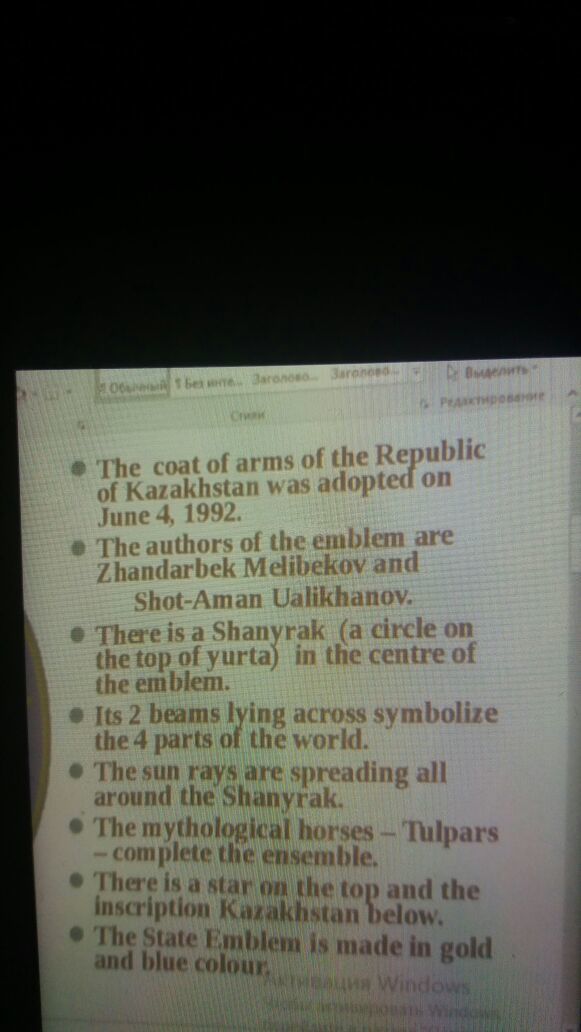 Герб Республики Казахстан был принят 4 июня 1992 года. Авторы эмблемы - Жандарбек Мелибеков и Шот-Аман Уалиха нов, В центре эмблемы находится Шанырак (круг на вершине юрты) , 2 луча, лежащие поперек, символизируют 4 части мира. Солнечные лучи распространяются вокруг Шанырака. Конные тульпарки завершают ансамбль. Наверху есть звезда и надпись Казахстан внизу. Государственный герб выполнен в золотом и синем цветах.