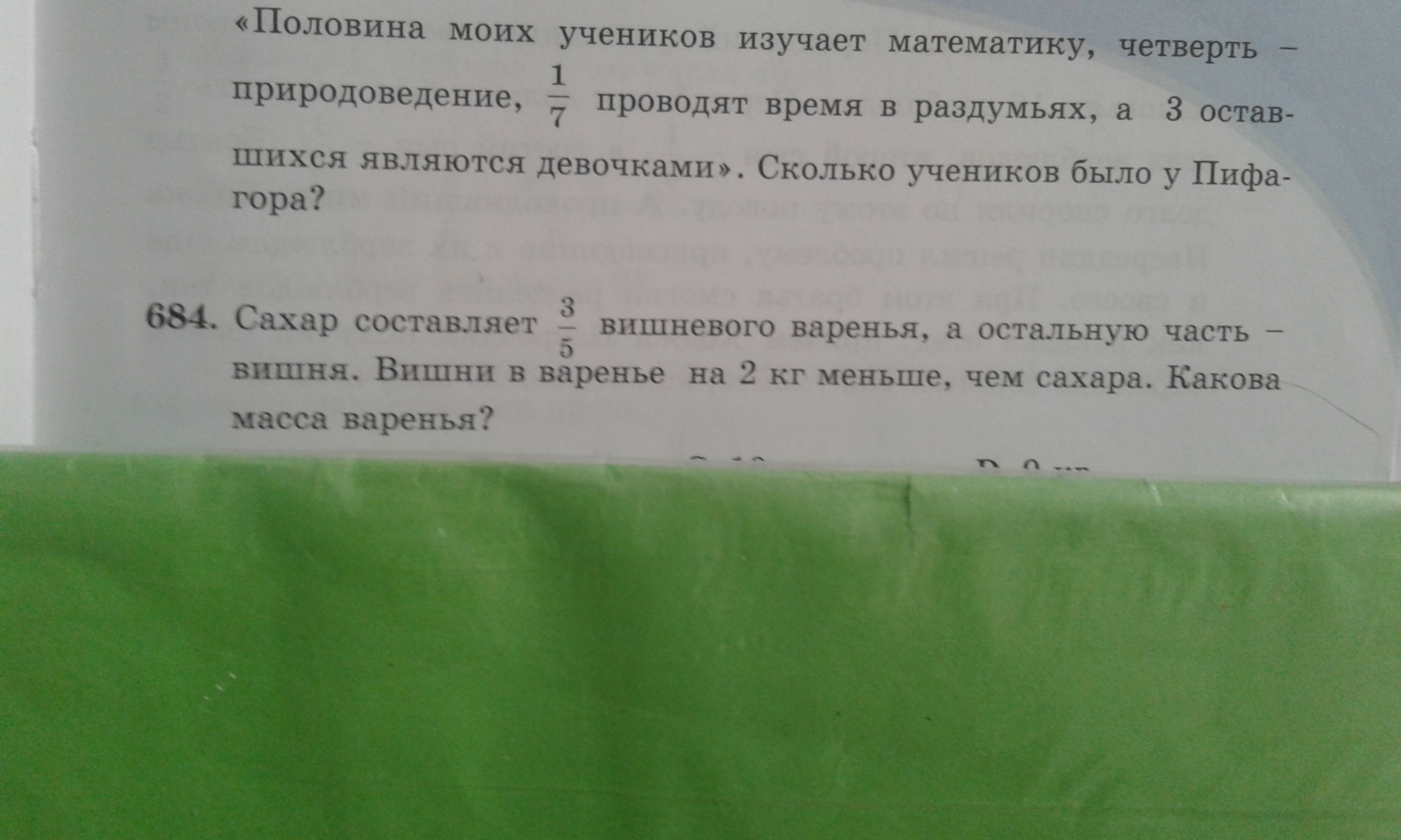 1-3/5=2/5 вишня 3/5-2/5=1/5(2 кг) 2×5=10кг масса варенья. проверка 10:5×3=6 кг сахара т.к. сахара на 4 кг больше чем вишни 6-2=4кг вишни 6+4=10 кг в 3/5+2/5=1(10кг)