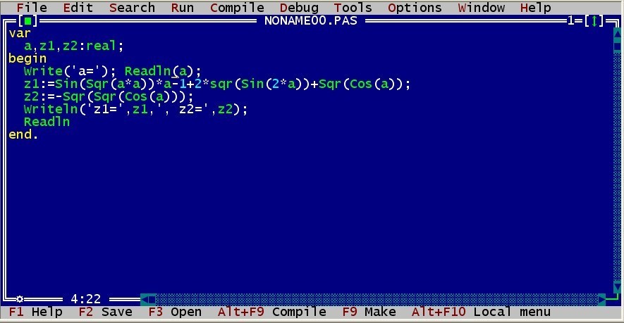 z1:=Sin(Sqr(a*a))*a-1+2*sqr(Sin(2*a))+Sqr(Cos(a));