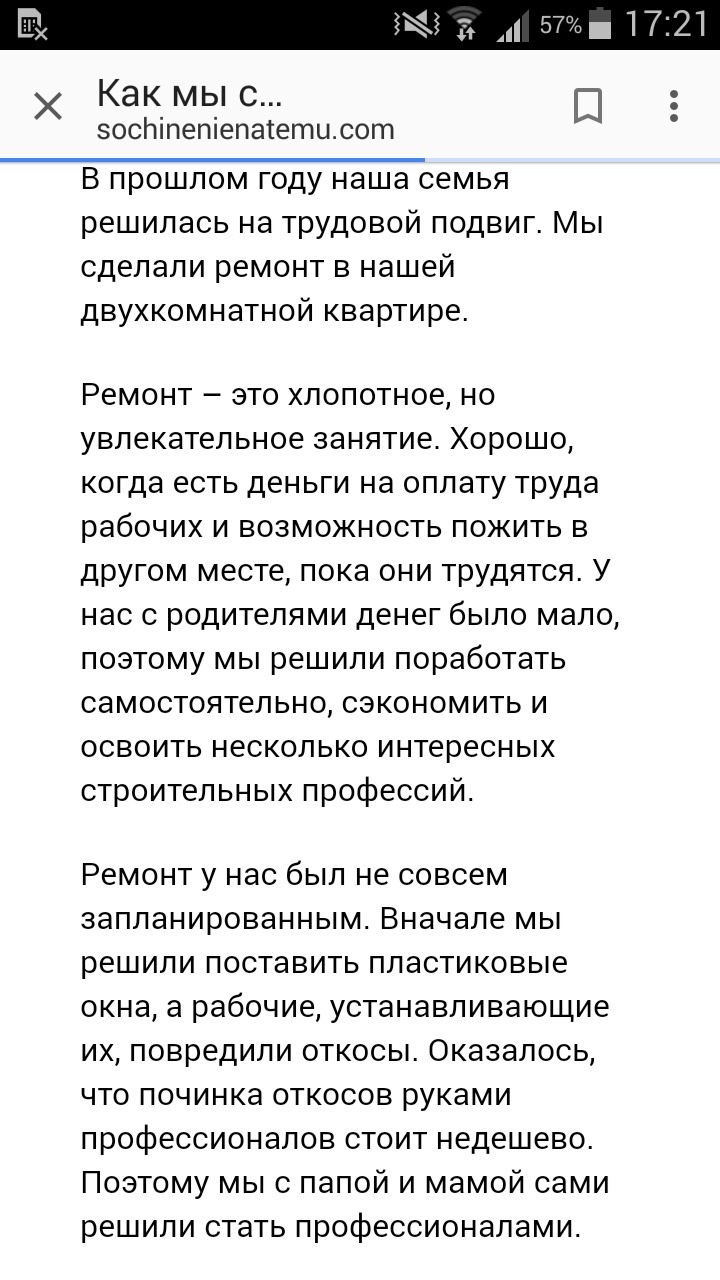 В один день мы с моими родителями затеяли ремонт.Хорошо когда у тебя есть много денег и ты можешь купить всё что захотишь.Но,у нас не было очень много денег.И мы решили всё экономить.Мы пошли в магазин и купили всё что нам надо.Когда мы пришли домой мы немного подождали наши мебели и через 1 час нам превезли наши мебели.Мы склеили обои и поставили мебель.В проктически всё получилось на "отлично".Я люблю делать ремонт.