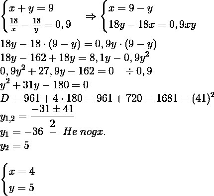 Первая группа прошла весь путь за 18/x часов, вторая за 18/y часов. Пусть вторая прошла весь путь на 0,9 часа быстрее, тогда
