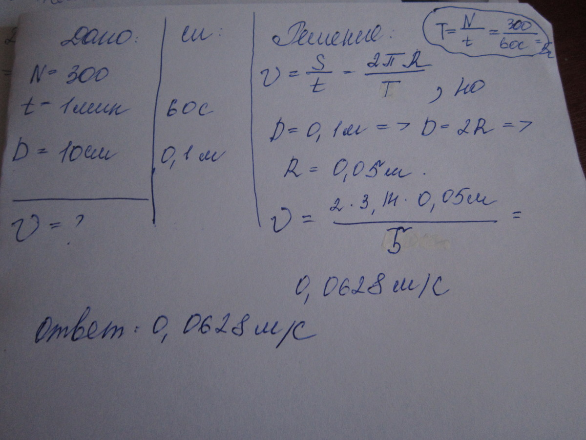 Вал делает 300 оборотов в минуту. Диаметр вала 10 см. Определите линейную скорость точек на поверхность этого вала!