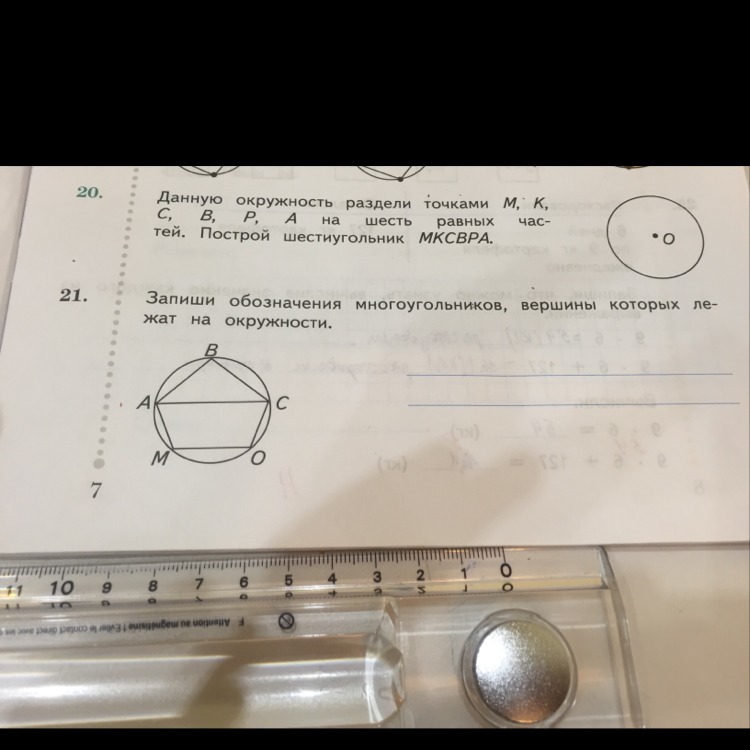 при делении окр. на 6 равных частей -- расстояние между точками на окружности равно радиусу. Циркуль открываешь на длину радиуса, отмечаешь точку на окружности, ставишь циркуль, рисуешь точки пересечения с окружностью. Уже три точки есть. Переносишь циркуль на крайнюю точку и снова отмечаешь. И т.д.