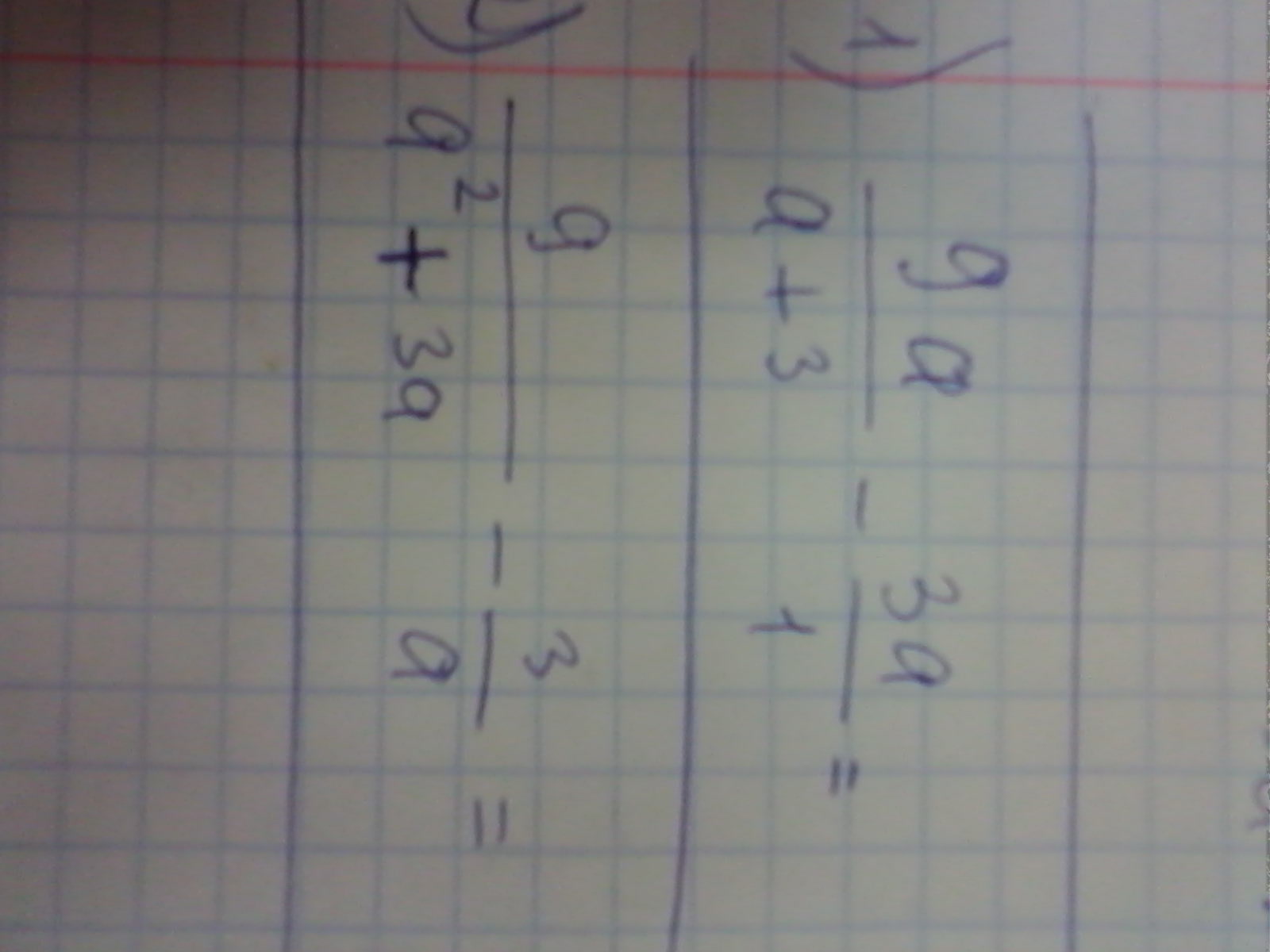 9a/a+3-3a/1=9a-3a(a+3)/a+3=9a-3a^2+9a/a+3=-3a^2+18a/a+3=-3a(a+6)/a+3=-3a*2=-6a