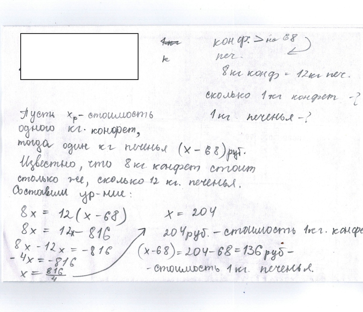 Килограмм конфет дороже килограмма печенья на 68р.Сколько стоит 1 кг конфет и сколько -1кг печенья,если за 8кг конфет заплатили столько сколько и за 12кг печенья