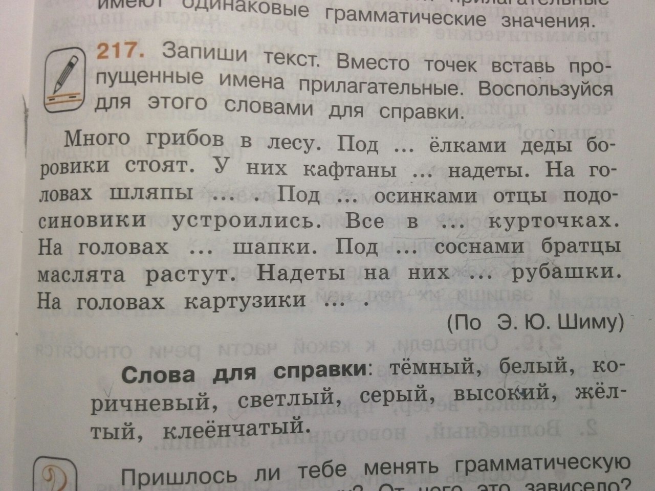 много грибов в лесу. под высокими елками деды боровики стоят. у них кафтаны белые надеты. на головах шляпы коричневые. под светлыми осинками отцы-подосиновики устроились. Все в серых курточках. На головах красные шапки. под высокими соснами братцы маслята растут. Надеты на них желтые рубашки, на головах картузики клеенчатые.