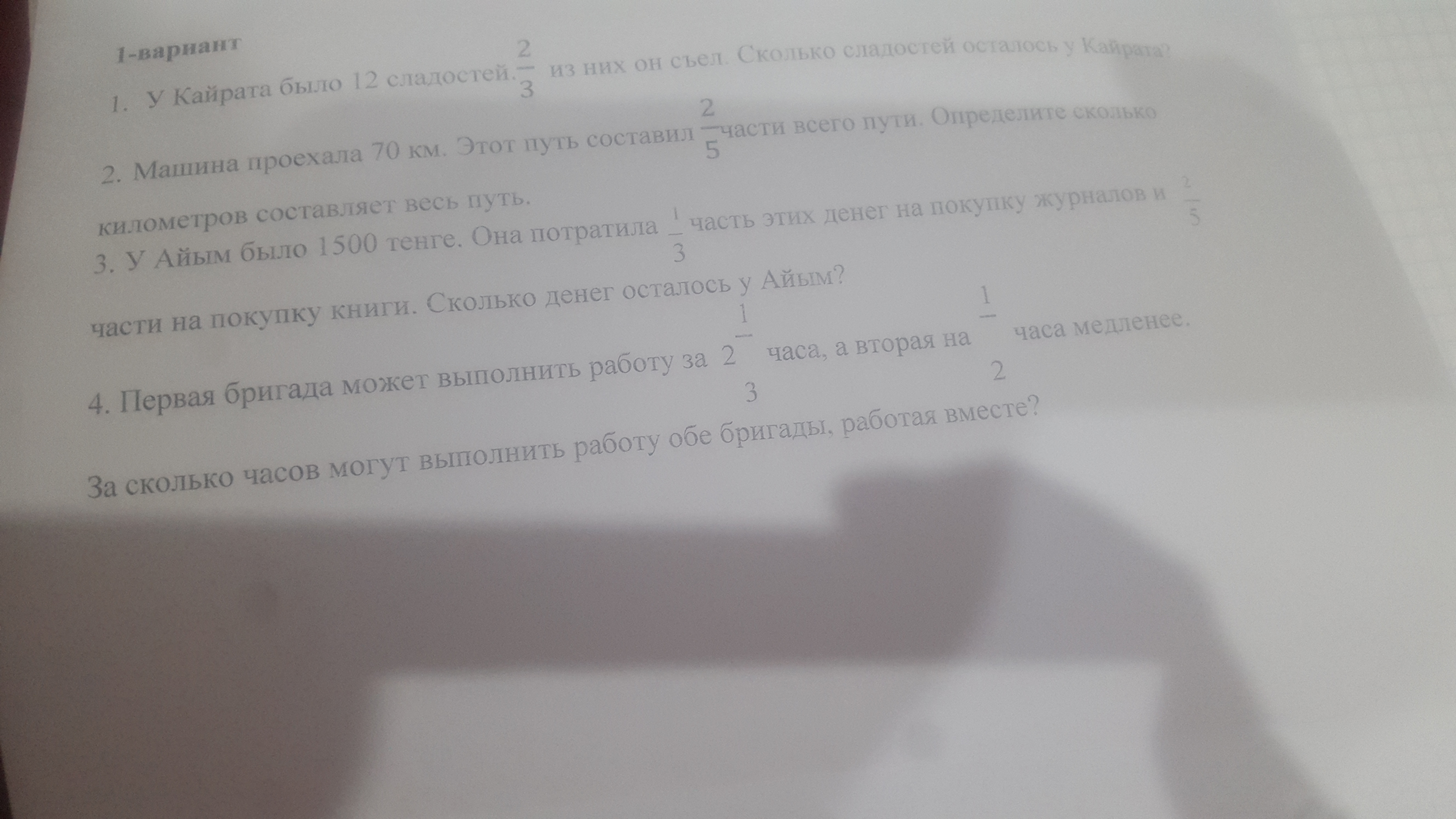 1) 1 - 1/3-2/5=4/15(часть) - осталось