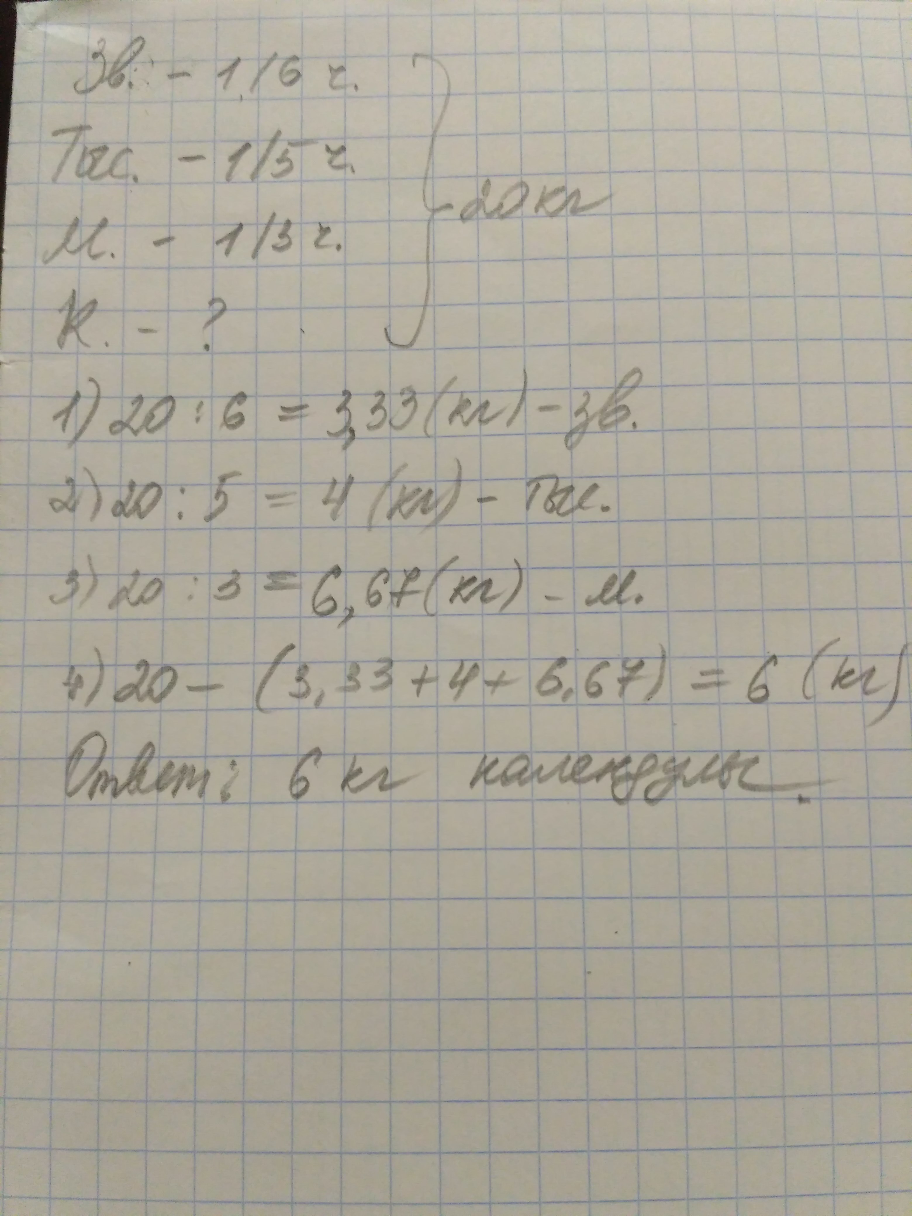 Дети собрали 20 кг лекарственных трав. Из них 1/6 составляет зверобой, 1/5 - тысячилистник, 1/3 - мята, а остальную часть-календула. Сколько килограммов колендулы собрали дети?ь