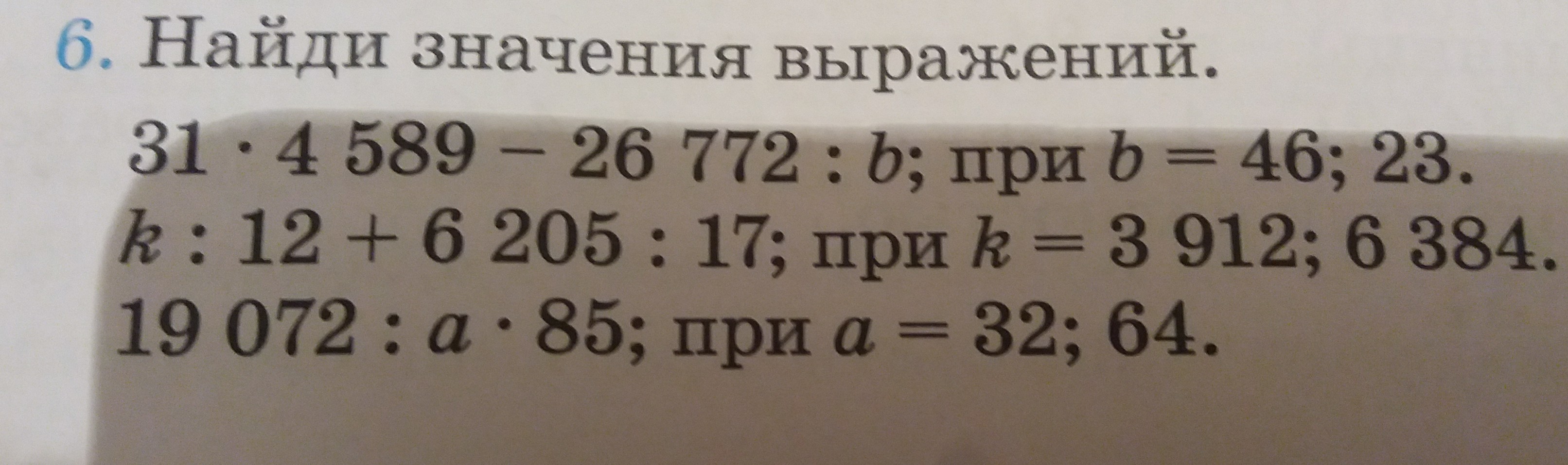 По данным примерам ты сможешь решить остальные? Если нет пиши я помогу) Если k=3912,то k:12+6205:17=3912:12+6205:17 1) 3912:12=326 2)6205:17=365 3)326+365=991 .. Если k=6384,то k:12+6205:17=6384:12+6205:17 1)6384:12=532 2)6205:17=365 3)532+365=897 Если а=32,то 19072:а•85=19072:32•85 1) 19072:32=596 2)596•85=50660 Если а=64,то 19072:а•85=19072:64•85 1)19072:64=298 2)298•85=25330