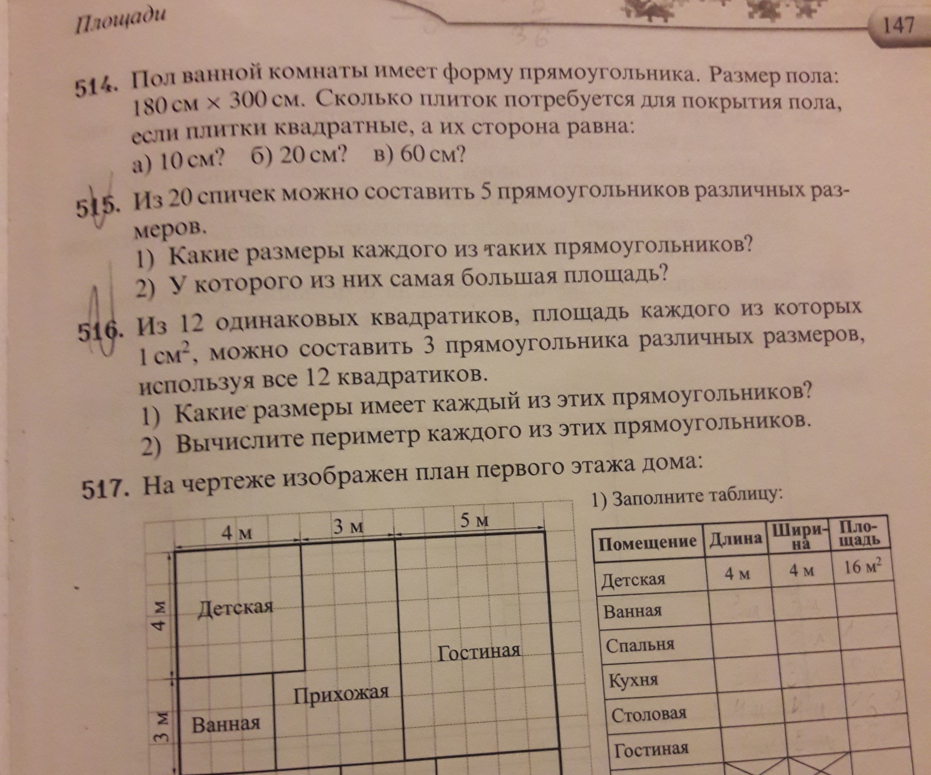 515: Здесь у нас 20 спичек, значит периметр должен быть равен 10. Имеем прямоугольники со сторонами (в спичках):