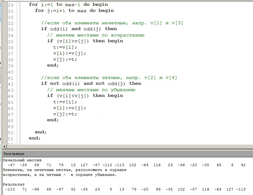Ввести массив x1,x2,...,x20. Элементы, на нечетных местах, расположить в порядке возрастания, а на нечетных в порядке убывания.