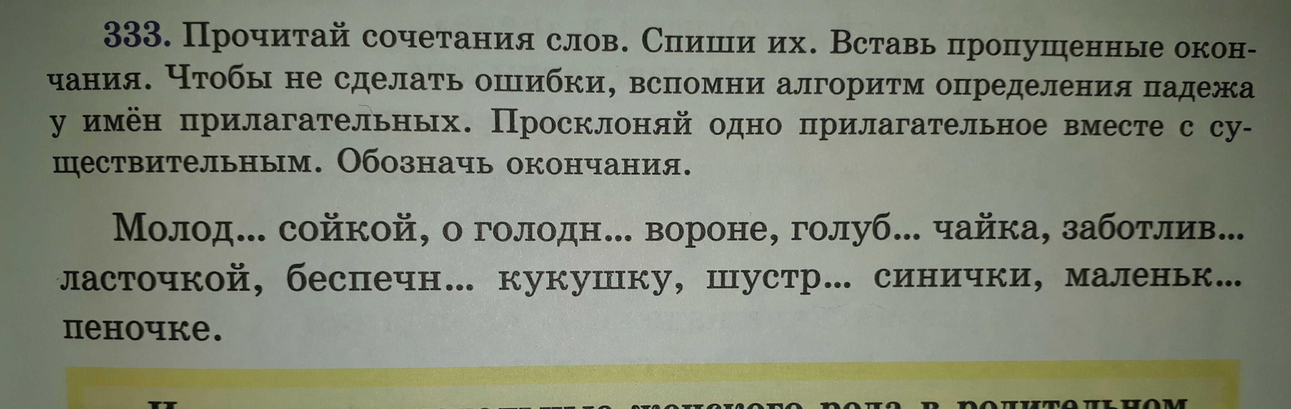 молодой сойкой(Твор.п.) о голодном вороне(Пред.п.) голубая чайка(Имин.п.) заботливой ласточкой(Твор.п) беспечную кукушку(Вин.п.) шустрые синички(Имин.п.) маленькой пеночке(Датель. п.)