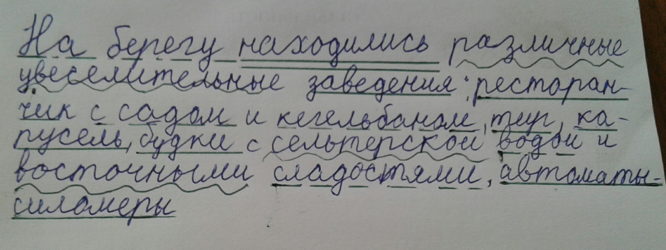 На берегу находились различные увеселительные заведения:ресторанчик с садом и кегельбаном, тир, карусель, будки с сельтерьской водой и восточными сладости, автоматы-силомеры.