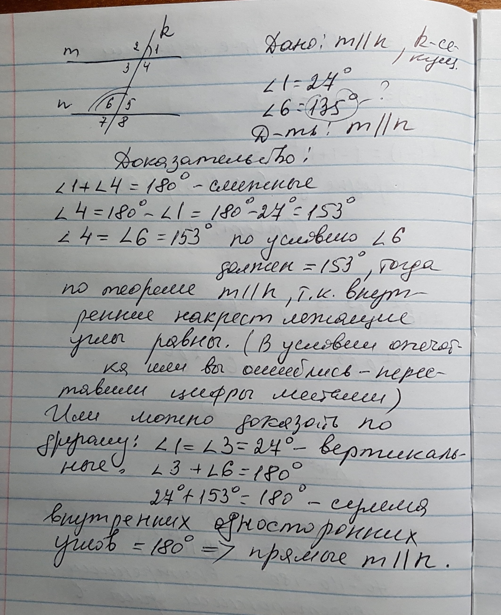 Дано: прямые m,n. k-секущая. угол 1=27 градусам, угол 6=135 градусам