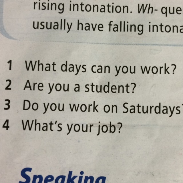 В какие дни ты работаешь?Ты студент?Ты работаешь по субботам?Что это за работа?Ответ:Monday-Понедельник, Thuesday-Вторник,Wednesday-Среда,Thursday-Четверг,Friday-пятница2,3)Yes или no 4)Пиши что за работа