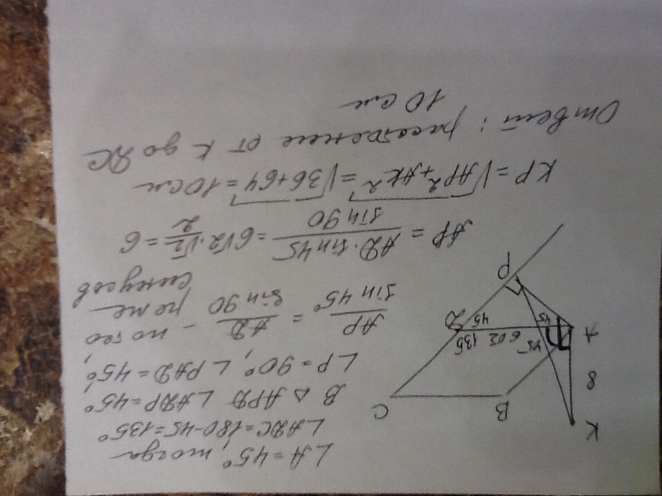 В параллелограмме АВСД угол А равен 45 и АД равно 6 корней из 2. Отрезок АК перпендикулярен плоскости АВС и АК равно 8. Вычислите расстояние от точки К до прямой СД.