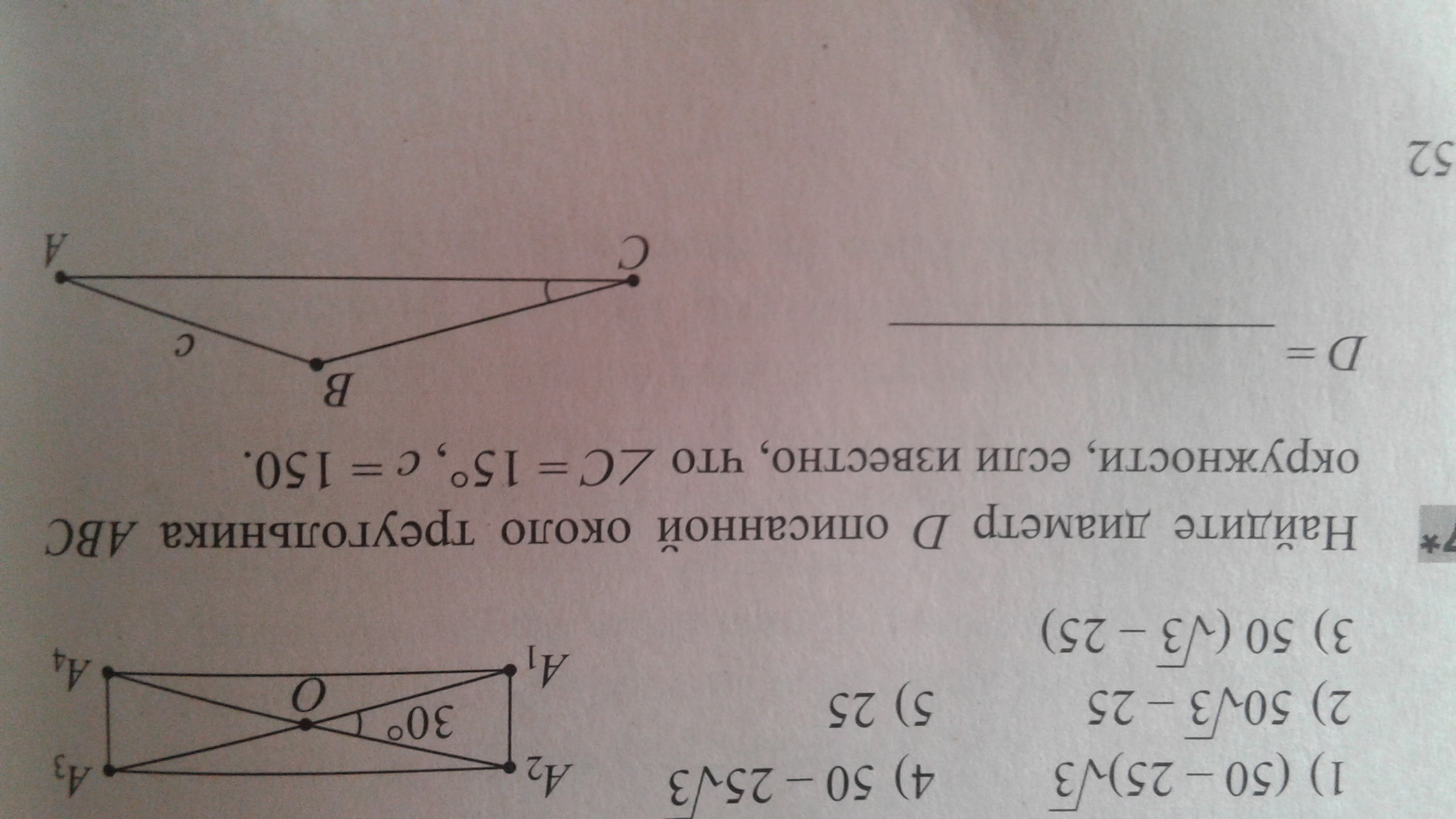 ПОМОГИТЕ ПОЖАЛУЙСТА!!!!Найдите диаметр D ОПИСАННОЙ ОКОЛО ТРЕУГОЛЬНИКА ABC ОКРУЖНОСТИ,ЕСЛИ ИЗВЕСТНО, ЧТО УГОЛ C=15 ГРАДУСОВ, С=150.