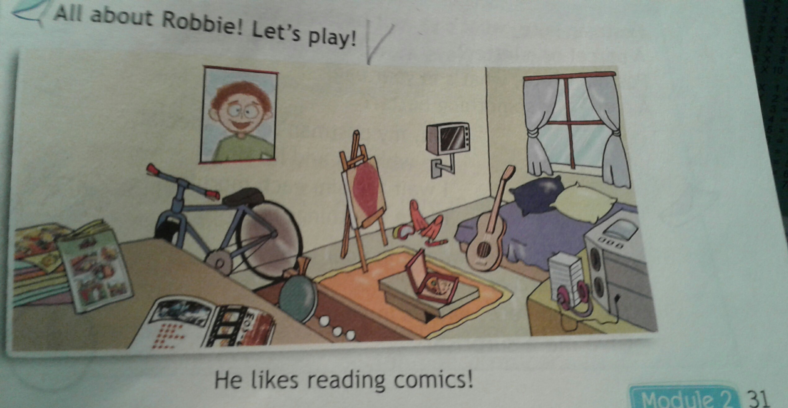 Robbie loves to draw, to ride a bike to watch cartoons to play guitar and read comics to play tennis, to swim, eat pizza and listen to music.