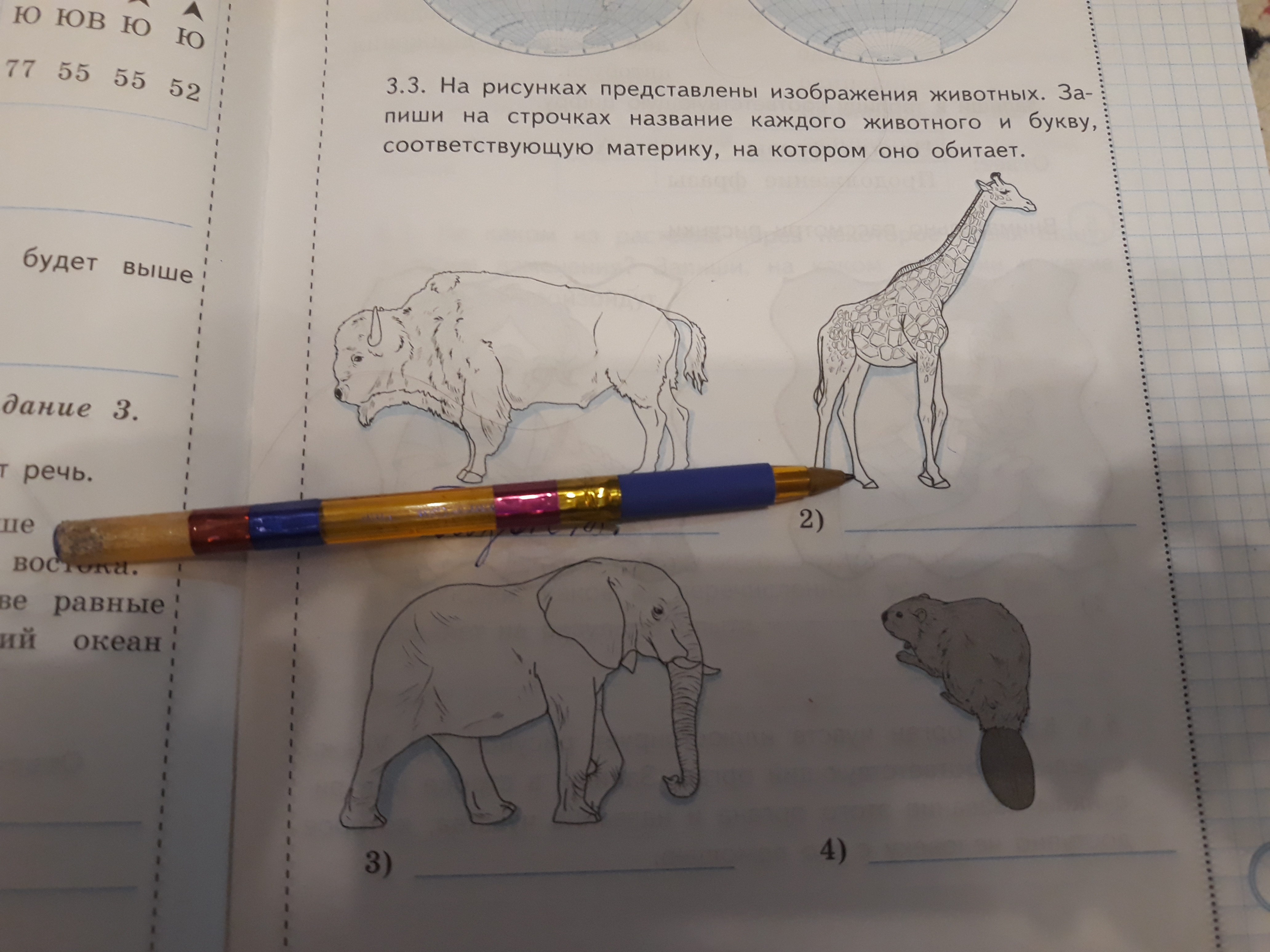 На рисунках представлены изображения животных.Запиши на строчках название каждого животного и букву,соответствующую материку,на котором оно обитает.
