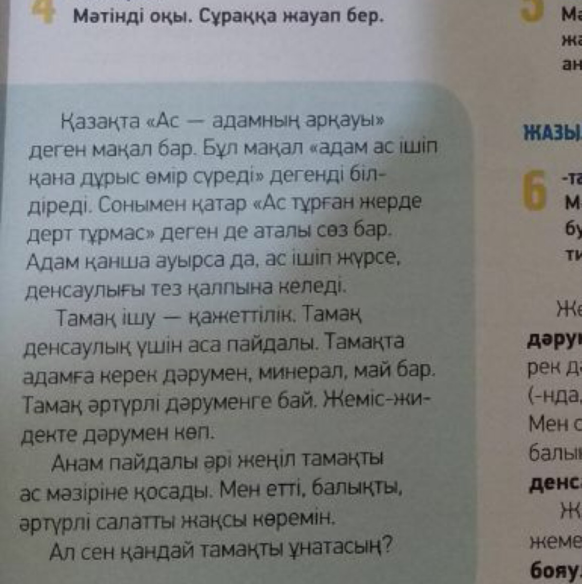У казахов есть пословица Еда всему голова. Эта пословица означает Человек живёт правильно питаясь. Старцы говорят где есть еда там нет болезней. Даже если человек много болел если правильно питаться можно выздороветь. Есть еду необходимость. Еда для человека очень полезна. В еде есть нужные для человека витамины, минералы и жиры.В еде есть разнообразные витамины. В фруктах и ягодах много витаминов. Мама говорит лёгкую и полезную еду.Я люблю мясо, рыбу