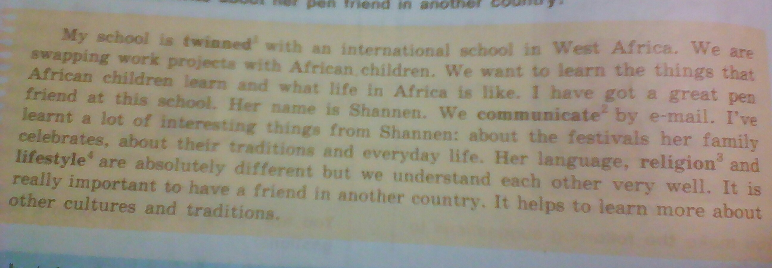 Моя школа побратима с международной школой в Западной Африке. Мы активно работаем над проектом с Afrie e. Мы хотим узнать, что африканские дети учат детей. как. У меня есть отличный друг в переписке и какая жизнь в Африке в школе. Ее зовут Шеннет. е связь по электронной почте. Он узнал много интересного из Шаннен: о праздниках, которые празднует ее семья, о их традициях и повседневной жизни. Ее язык, религия и образ жизни совершенно разные, но мы очень хорошо понимаем друг друга. Очень важно иметь друга в другой стране. Это помогает узнать больше о других культурах и традициях.
