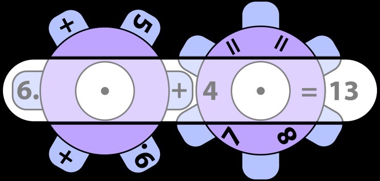 Укажи количество правильно решенных примеров в выделенной зоне за один полный оборот зубчатых колес. Цифры в примере не должны быть перевернутыми.