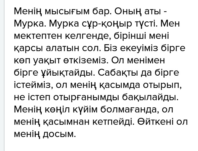 У меня есть кошка. Её зовут Мурка. Цвет шерсти у Мурки серо-коричневый. Когда я прихожу из школы она меня встречает. Она со мной спит. И уроки мы делаем вместе, она смотрит что я делаю. Когда у меня нет настроения, она не отходит от меня. Она мой друг