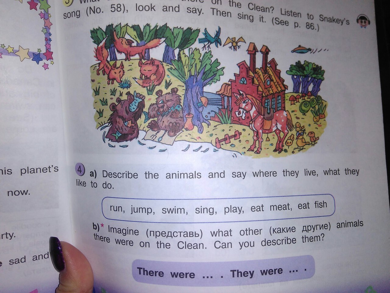 бег(бежать),прыгать,плавать,петь,играть,ест мясо,ест рыбу.