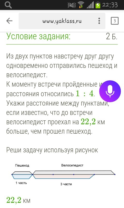 1) 4-1=3(части) - больше проехал вело, что равно 22,2 км