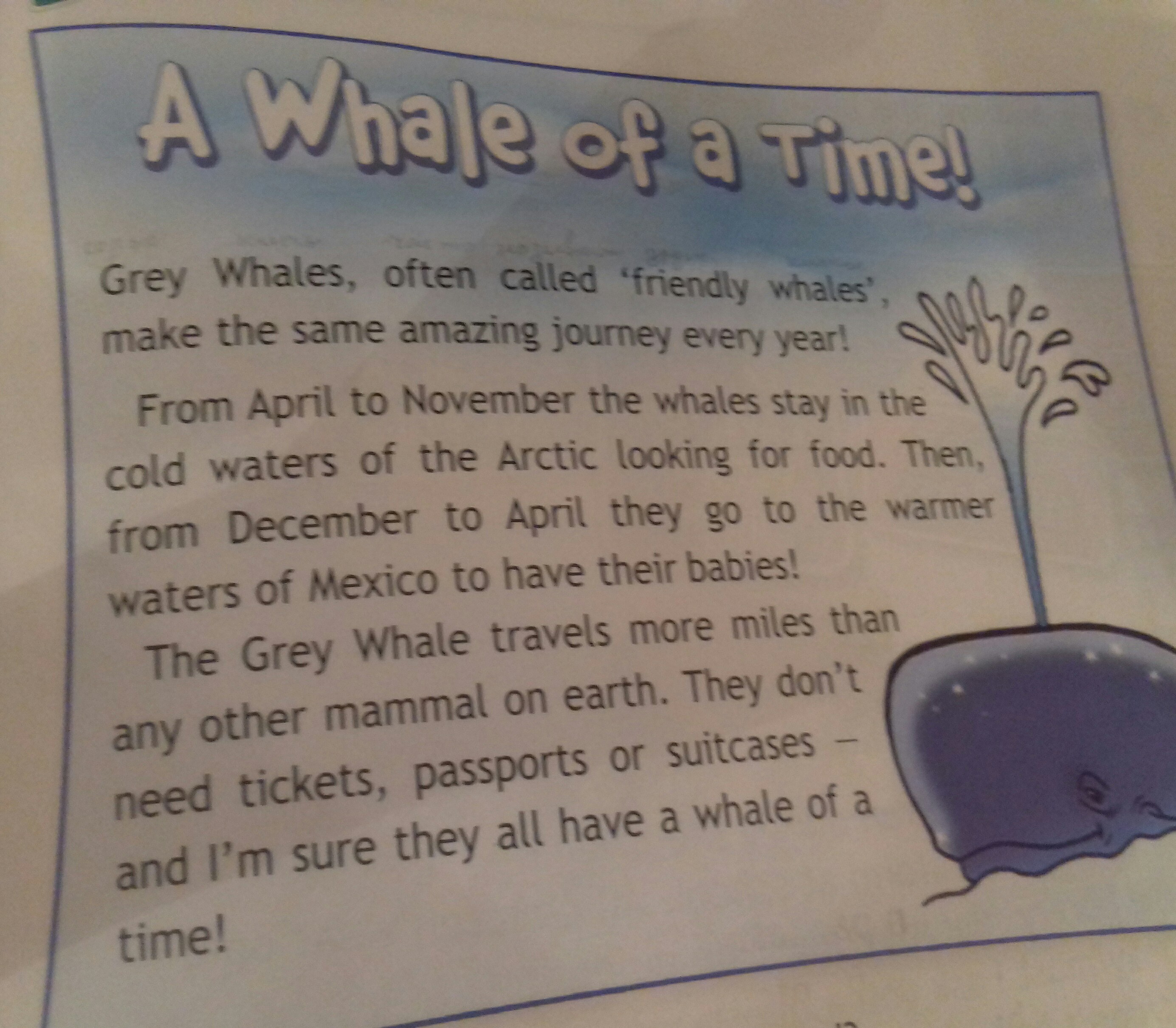 Серые Киты проплывают намного больше миль чем другие млекопитающие. Они не имеют путевок, паспортов или чемоданов, и я уверен все это имеют киты каждый раз(это тоже под сомнением)
