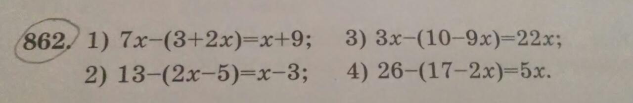 1)7x-(3+2x)=x+9 2)13-(2x-5)=x-3 3)3x-(10-9x)=22x 4)26-(17-2x)=5x