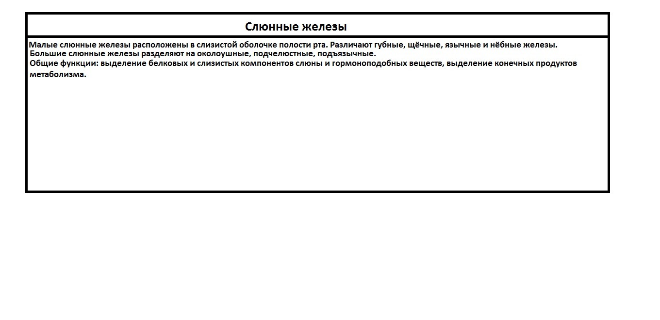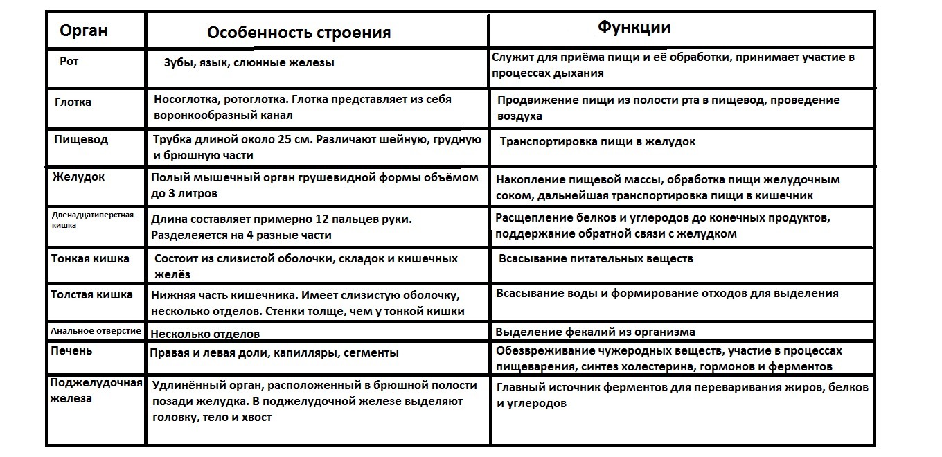 Даны органы и вот по ним надо заполнить 2 и 3 столбик: Рот. глотка. пищевод. желудок. двенадцатиперстная кишка. тонкий кишечник. толстый кишечник. анальное отверстие. печень. железы пищеварительного канала. 3 пары слюнных желез (отдельно).
