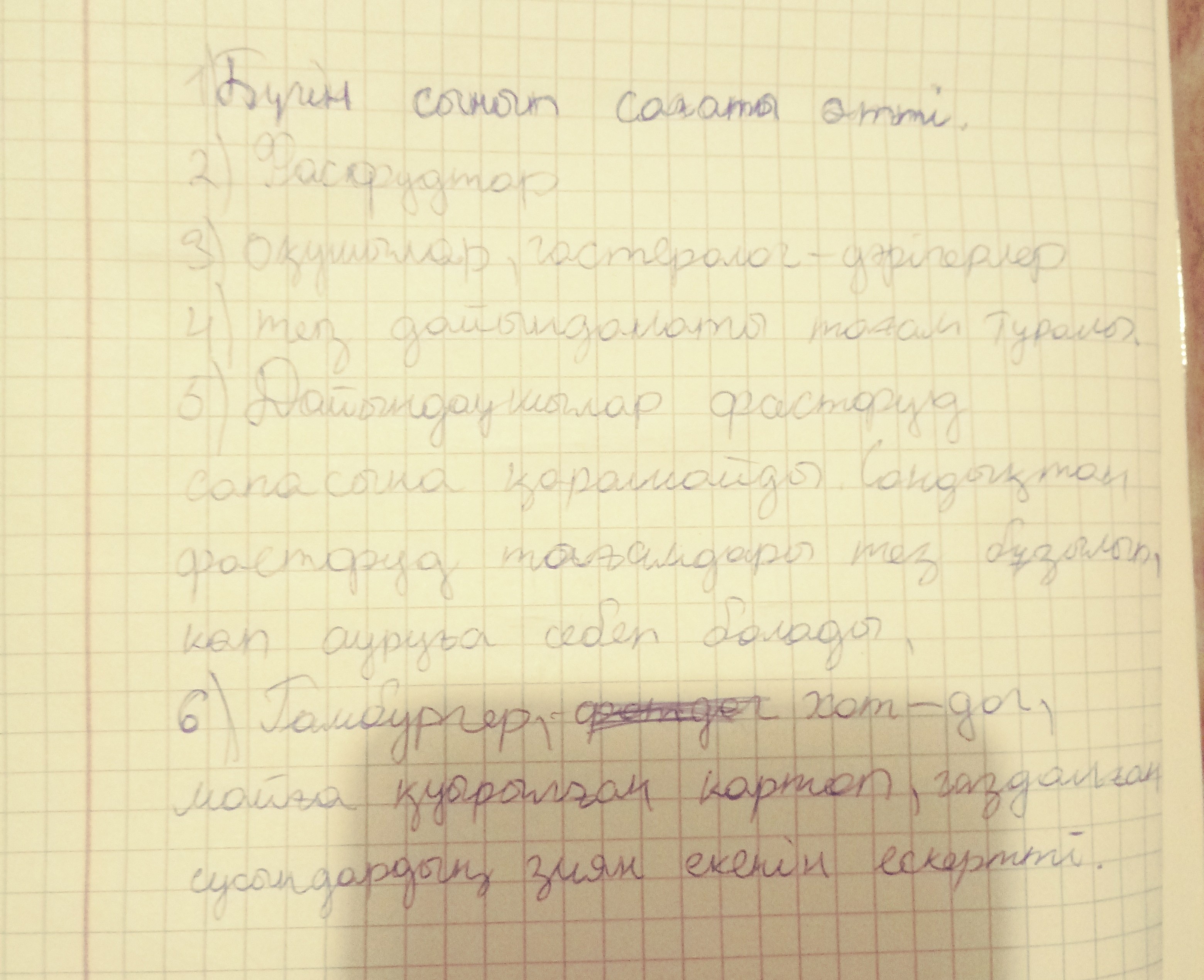1) Бүгін сынып сағаты өтті. 2)фастфудтар 3)оқушылар,гастеролог-дәрігерлер. 4)тез дайындалатын тағам туралы. 5) дайындаушылар фастфуд сапасына қарамайды. Сондықтан фасфуд тағамдары тез бұзылып,көп ауруға себеп болады. 6) гамбургер,хот-дог, майға қуырылған картоп, газдалған сусындардың зиян екенін ескертті.