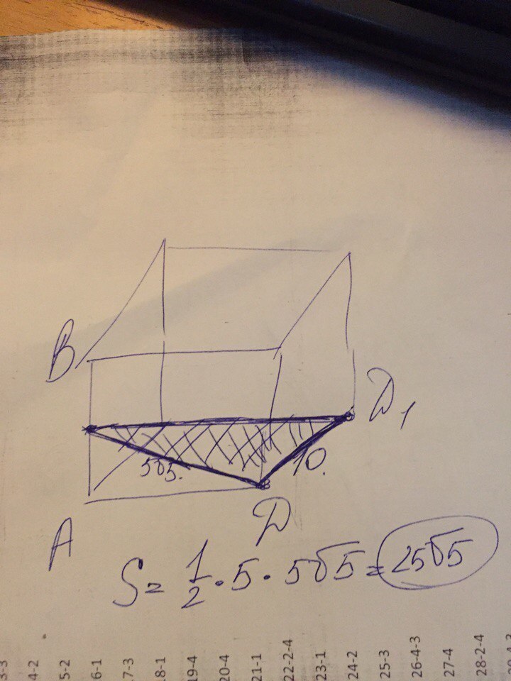 Хотя я сейчас уже думаю, что там получится не прямоугольник, а треугольник так как написано что через среедину ребра АВ то есть только чреез него. ПОлучается что площадь будет равна по формуле треугольника, полусума основая * высоту. S=12*10*5корень из 5=25корень из 5