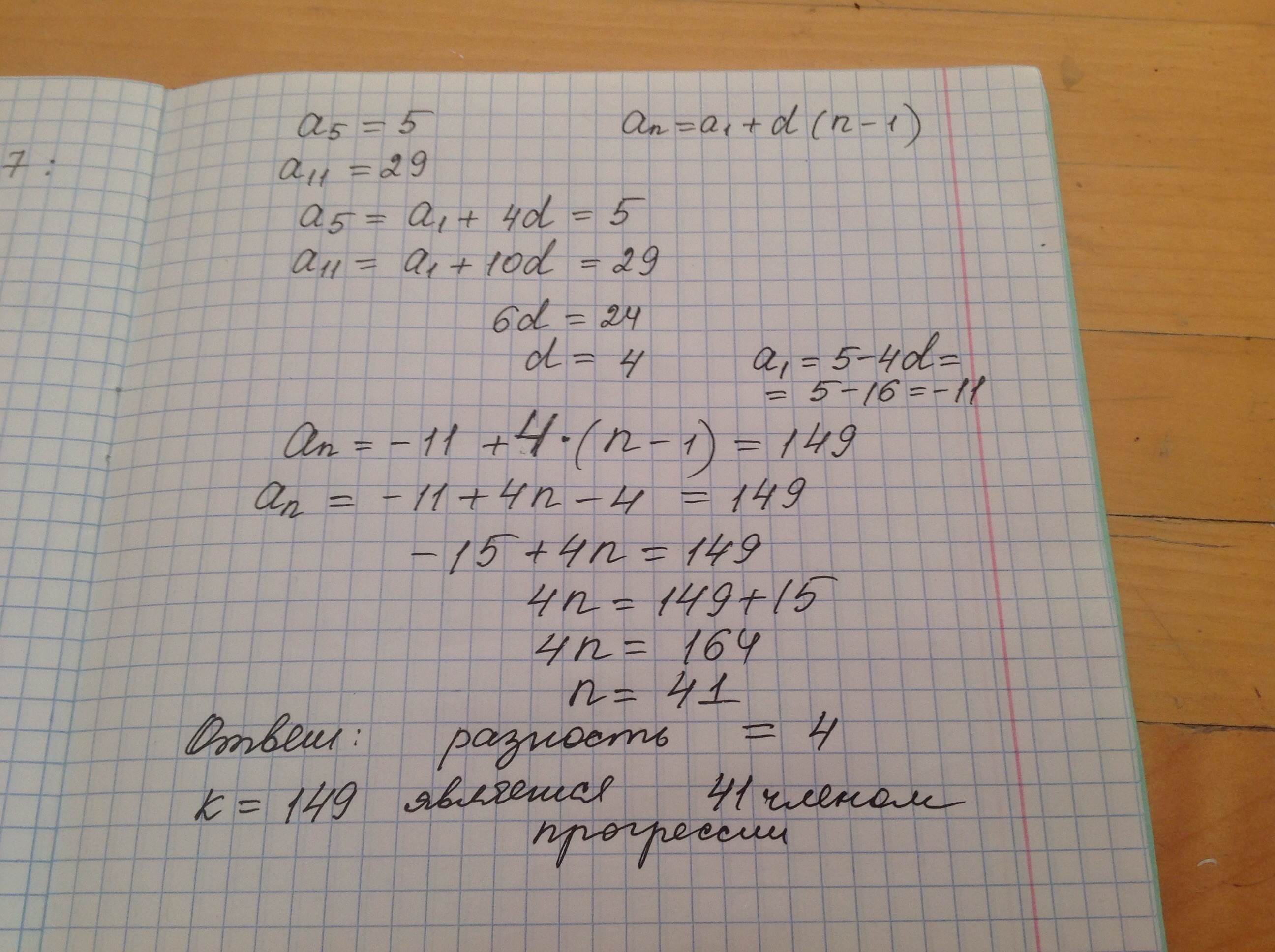 Найти разность и первый член арифметической прогрессии а1, а2,...., аn,.... и выяснить, является ли число k членом этой прогрессии, если а5=5 а11=29 k=149