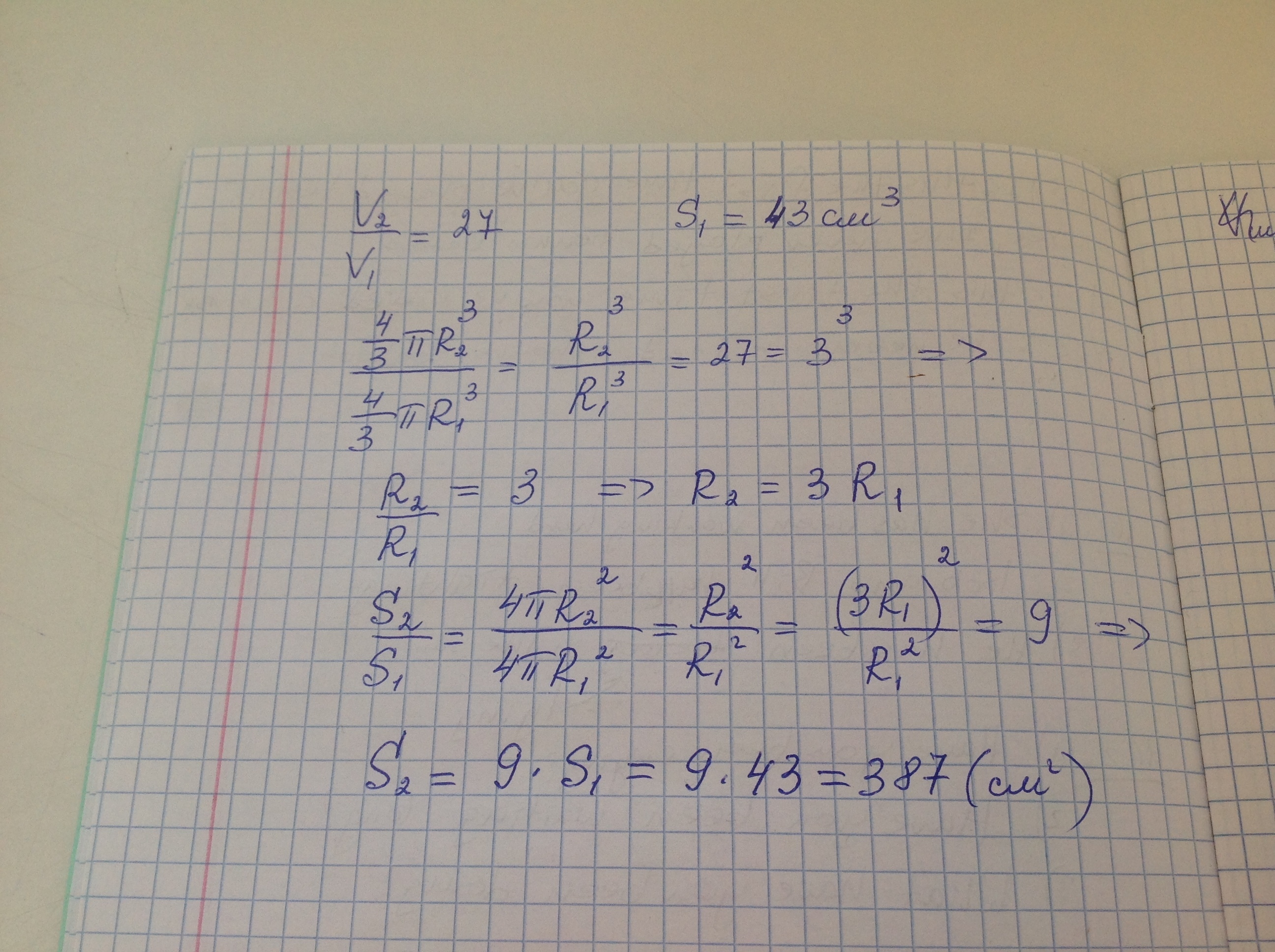 Площадь поверхности первого шара 43 см3. Объем второго шара в 27 раз больше за объем первого. Найти площадь поверхности второго шара.
