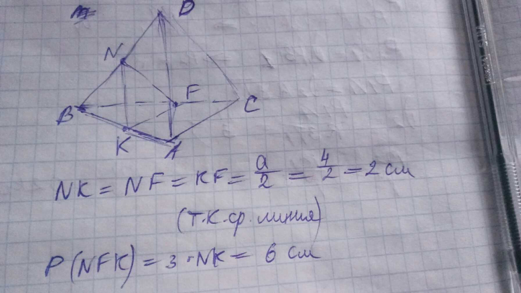 DABC-тетраэдр с ребром 4 см найдите периметр сечения тетраэдра проходящего через середины рёбер AB BC DB