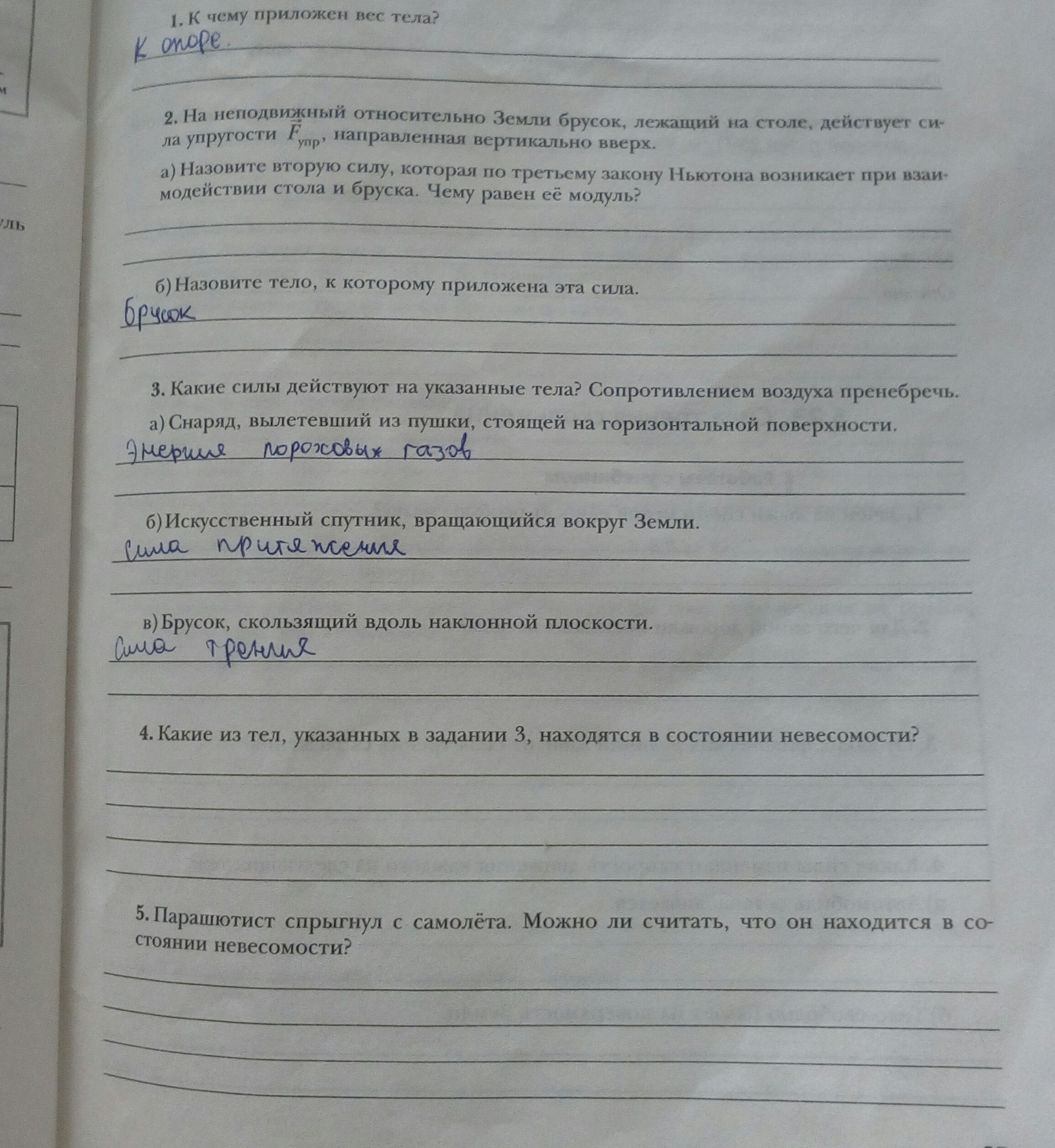 5) да, пока не раскрыл парашют . Свободно (только под действием силы тяжести) падающие тела находятся в невесомости. Веса нет, они не давят на опору.