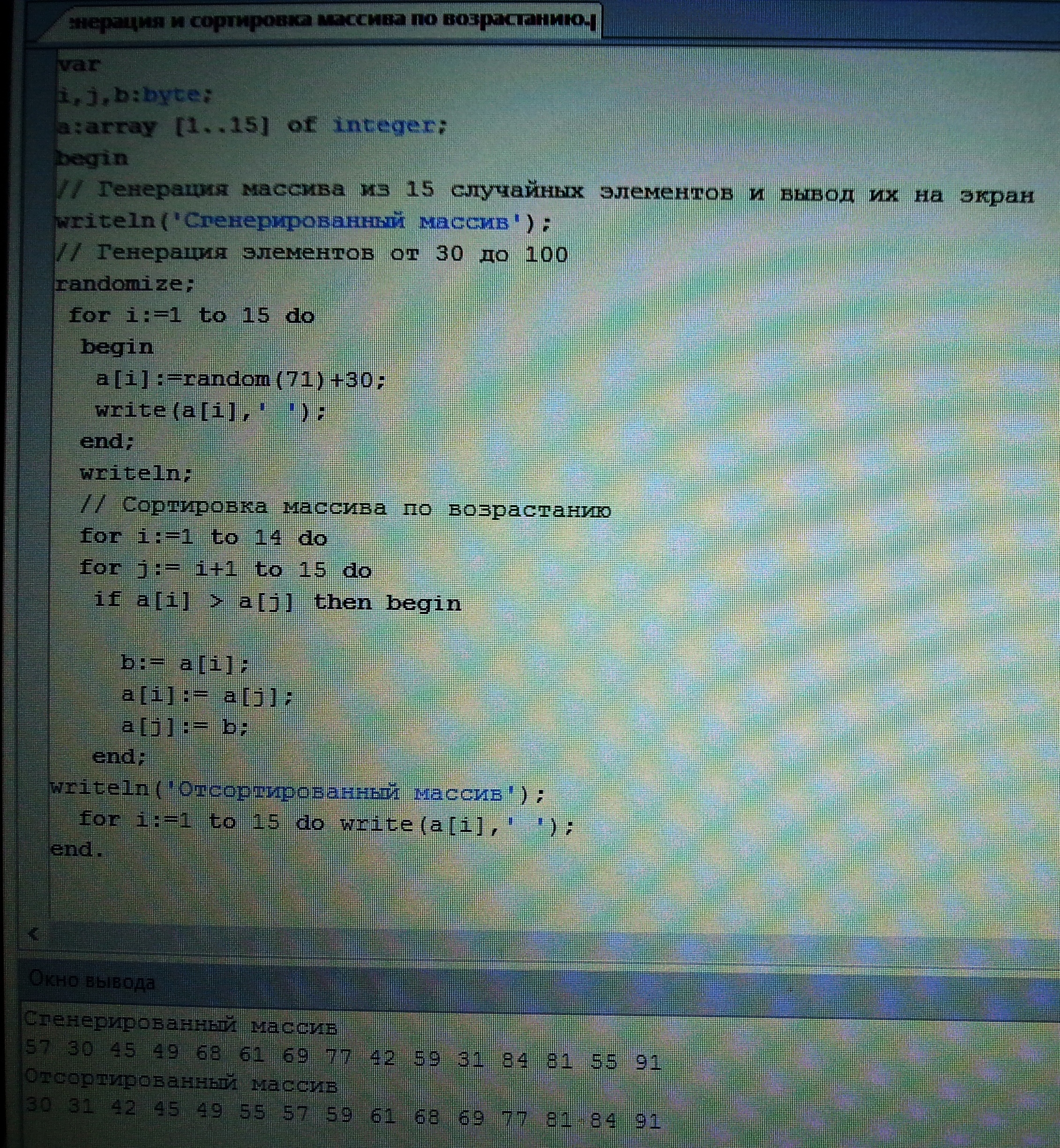 vari,j,b:byte;a:array [1..15] of integer;begin// Генерация массива из 15 случайных элементов и вывод их на экранwriteln('Сгенерированный массив');// Генерация элементов от 30 до 100randomize; for i:=1 to 15 do begin a[i]:=random(71)+30; write(a[i],' '); end; writeln; // Сортировка массива по возрастанию for i:=1 to 14 do for j:= i+1 to 15 do if a[i] > a[j] then begin b:= a[i]; a[i]:= a[j]; a[j]:= b; end;writeln('Отсортированный массив'); for i:=1 to 15 do write(a[i],' ');end.