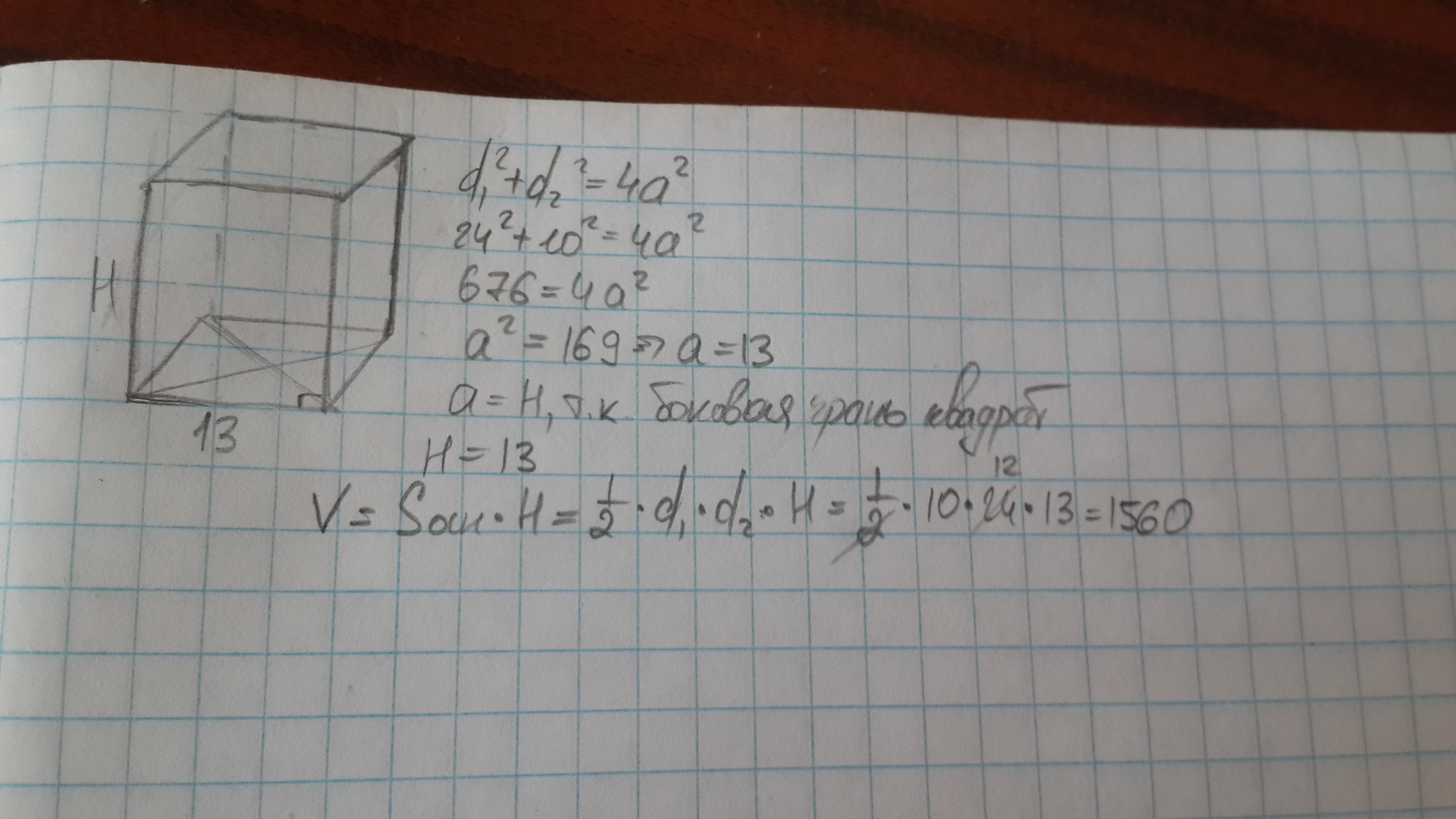 Основанием прямой призмы является ромб с диагоналями, равными 24 и 10. Все боковые грани призмы являются квадратами. Найдите объём призмы.