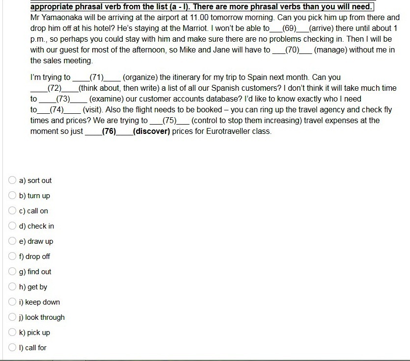 69 check in 70 get by 71 sort out 72 draw up 73 look through 74 call on 75 keep down 76 find out