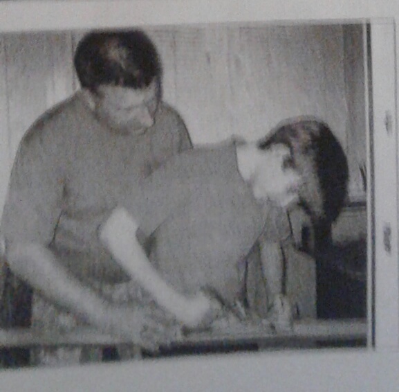 На этой фоьки изображенно как отец или учитель учит своего сына или ученика шкурить доски или делать подделки из дерева , роботать с деревом!