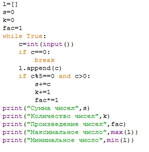 Напишите программу, которая в последовательности целых чисел определяет сумму положительных чисел, кратных 5. Программа получает на вход целые числа, кол-во введенных чисел неизвестно, последовательность чисел заканчивается числом 0. Кол-во чисел не превышает 1000. Введенные числа по модулю не превышают 30 000. Программа должна вывести одно число:сумму положительных чисел, кратных 5.