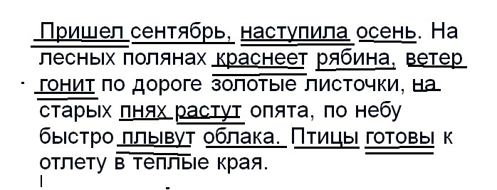 Пришел сентябрь, наступила осень. На лесных полянах краснеет рябина, ветер гонит по дороге золотые листочки, на старых пнях растут опята, по небу быстро плывут облака. Птицы готовы к отлету в теплые края.